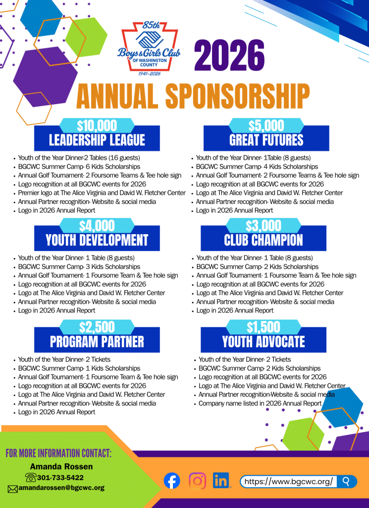Thank you for your consideration. Please feel free to reach out to Amanda Rossen at 301-992-3196 or amandarossen@bgcwc.org with any questions. We look forward to having you as partner on our mission.